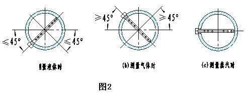 3、對(duì)于垂直管道,檢測桿可安裝在管道水平面沿管道圓周360°的任何位置上,高低壓引壓管接頭應(yīng)處于同一水平面上。對(duì)于水平管道,在測量液體時(shí)檢測桿插入位置應(yīng)位于管道橫截面水平面中心線45°以下的范圍內(nèi);測量氣體時(shí)檢測桿插入位置應(yīng)位于管道橫截面水平面中心線45°以上的范圍內(nèi);測量蒸汽時(shí)檢測桿應(yīng)水平插入,見圖2。