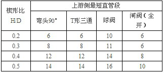 楔形流量計(jì)上游側(cè)最短直管段見(jiàn)下表: